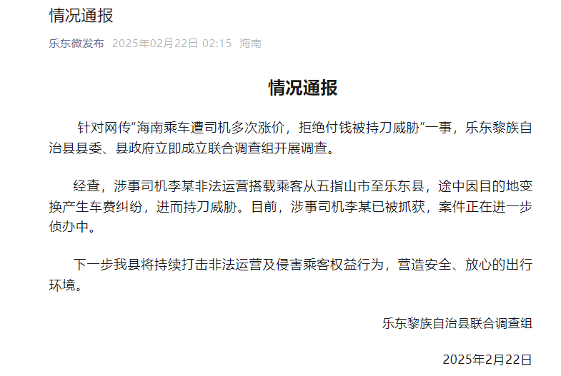 针对网传“海南搭车遭司机屡次加价,圮绝付钱被持刀挟制”一事,乐东黎族自治县县委、县政府立即树立纠合探听组开展探听。